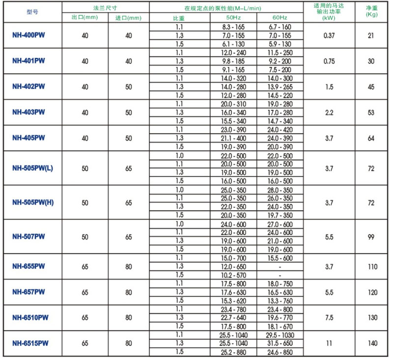 9種型式,流速最高達1400公升/分鐘,揚程37米。